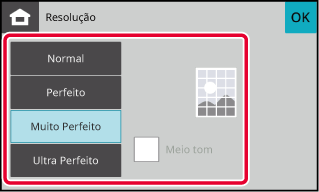 Selecione esta definição se o original for uma fotografia ou tiver várias tonalidades de cor (como um original a cores). Esta definição produz uma imagem mais nítida do que utilizando as definições [Perfeito], [Muito Perfeito] ou [Ultra Perfeito], por si só. Se utilizar [Normal] não pode usar os meios tons. |