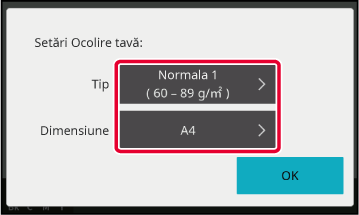 ALIMENTAREA CU HÂRTIE A TĂVII MANUALEApare o casetă de dialog, dacă doriți să modificați setările, atingeți [Tip] sau [Dimensiune] în caseta de dialog și selectați formatul și tipul de hârtie.