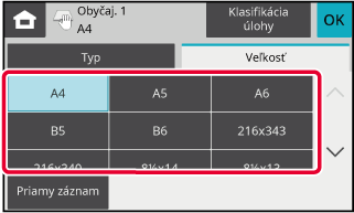 Ak chcete zadať číselnú hodnotu veľkosti vloženého papiera, klepnite na tlačidlo [Priamy záznam]. Po dokončení nastavenia sa dotknite tlačidla [OK].