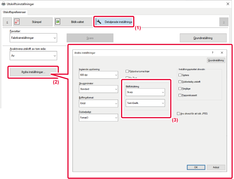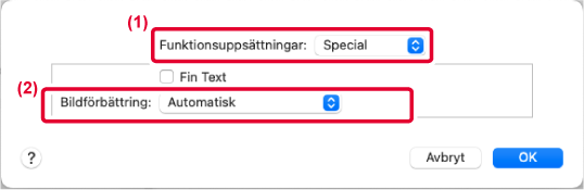 Du kan göra kanterna på text och grafik jämnare eller skarpare. Auto: Utför optimal bildförbättring. Av: Ingen bildförbättring tillämpas. Skarp: Skarp bildförbättring tillämpas. |