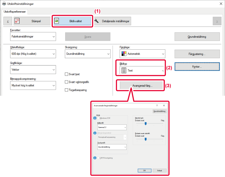 Med alternativen nedan kan du modifiera bearbetningen av färgbilder efter specifika önskemål. (Färgmatchningsmetod: Metod för konvertering av RGB-färger på skärmen, t.ex. till skrivarens CMYK-färger) |