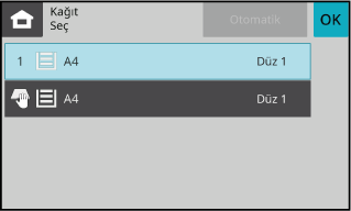 kağıda sahip tablayı otomatik olarak seçmek üzere ayarlanmıştır (Otomatik