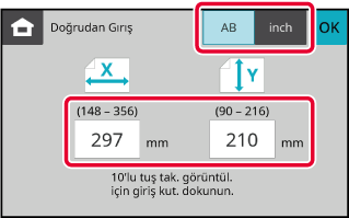 Yüklenen kağıt boyutu olarak sayısal bir değer girmek için [Doğrudan Gırış] tuşuna dokunun. Ayarlar tamamlandıktan sonra, [OK] tuşuna dokunun.