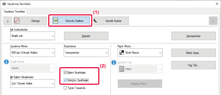 soluk renkli metin ve çizgiler siyah olarak yazdırılabilir. Bu işlev,