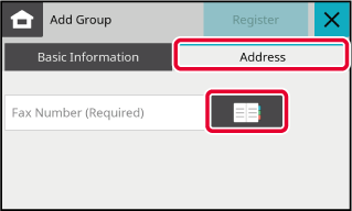 Tap the [Fax Address Control] key on the Home Screen, the [Address Control] key on the menu, or the [Address Control] icon on the Address Book screen.