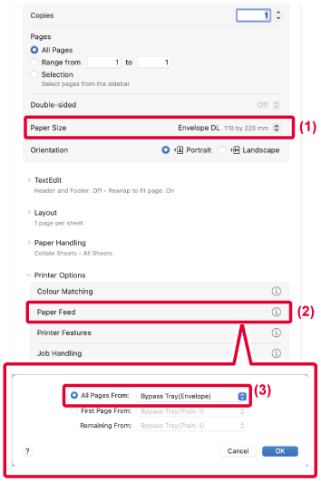 - V nabídce „All Pages From“ vyberte [Bypass Tray (Envelope)] nebo [Tray 1].