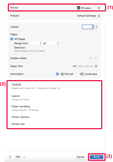 předpokládá použití operačního systému macOS verze 14 a instalace ovladače PPD. Obrazovky