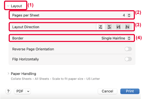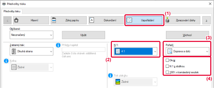 Když například zvolíte [2:1] (2 strany na list) nebo [4:1] (4 strany na list), dostanete