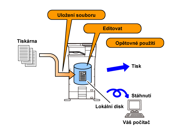 Tato funkce ukládá tisková data z počítače na místní jednotku stroje nebo na externí