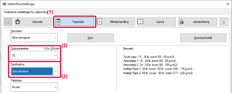 [Papirkilde]: Indstil størrelsen og typen af det papir, der anvendes til udskrivning,