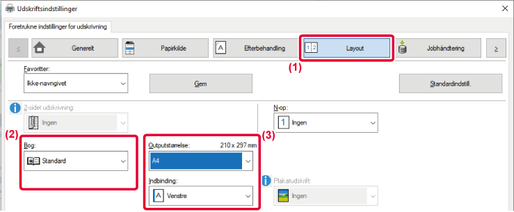 - Vælg den angivne udskriftsstørrelse og indbindingssiden.
