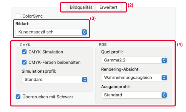 "Bildart" die Option [Kundenspezifisch], aktivieren das Kontrollkästchen [CMYK-Simulation]