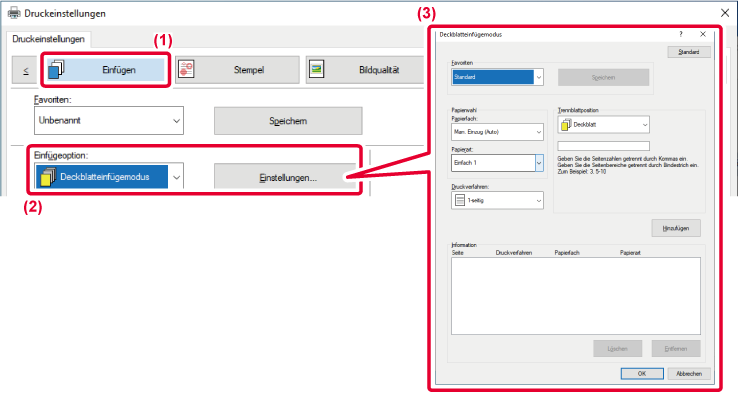 - Wählen Sie unter [Einfügeoption] die Option [Deckblatteinfügemodus] aus, und klicken