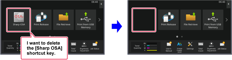 The settings are saved in the machine and applied.You can add shortcut keys to the home screen, and delete unneeded shortcut keys.