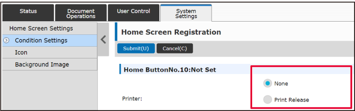 When you click the [Submit] button, the [Home Screen Registration] screen closes.When you have finished configuring the settings, click the [Submit] button.