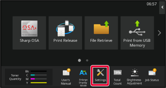 When the USB device is connected to the machine, the popup window will be appeared. Tap the [OK] key.Tap the [Settings] key on the Home screen.