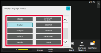 This settings may require that you enter your user password. If you did not perform user authentication, you must enter the administrator password.Select the language you want to change from the list.