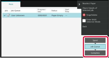 Jobs move among the lists according to the processing status, from [Spool], [Job Queue]