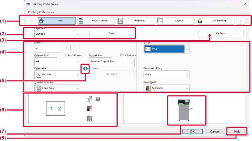 [Layout]: Select functions related to the layout such as two-sided printing and booklet.