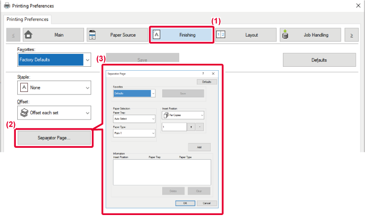 - Select the paper tray and paper type from "Paper Selection", and specify the separator
