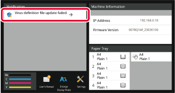 When a virus is detected with respect to the input data, the touch panel will display that a virus has been detected, the input data or the job to be input will be cancelled, and the data or job data that was about to be output will be discarded. Data in the data input source (USB memory, external server, etc.) will not be deleted. When a virus is detected with the output data, the touch panel will display that a virus has been detected, the output data or the job to be output will be cancelled, and the output data or job data will be deleted. The virus detection message will be displayed in the "Notification" of the System Information screen. |