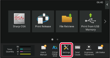 "Settings" allows management of various functions that will make it easier to use the machine, such as default registration for each function, network connection setting, and log check of operation status.