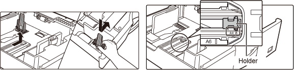 plate all the way to the paper feed opening (right side), and pull up. If the machine does not recognize the paper size even though 8-1/2" x 14" size is correctly loaded in tray 2 to 4, check if the holder in the tray is positioned at 8-1/2" x 14".TRAY 1 - 4 ![]() |