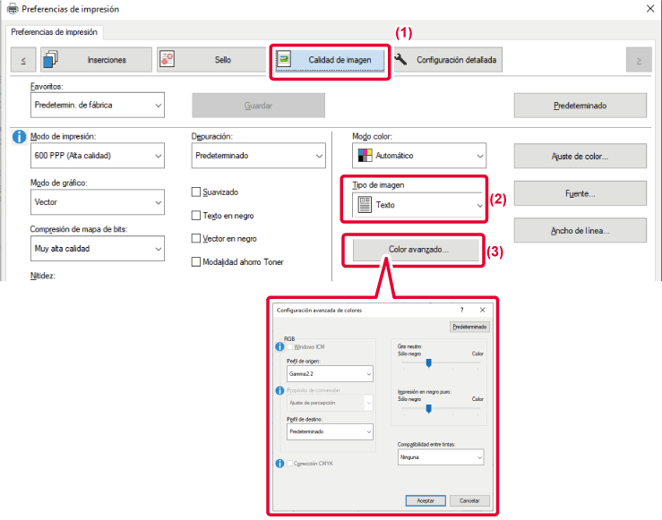 está disponible la configuración de color avanzada, como la configuración de gestión