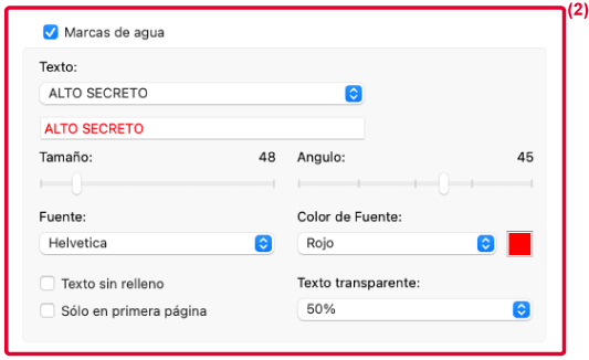 - Haga clic en la casilla de verificación [Marcas de agua] y configure las opciones