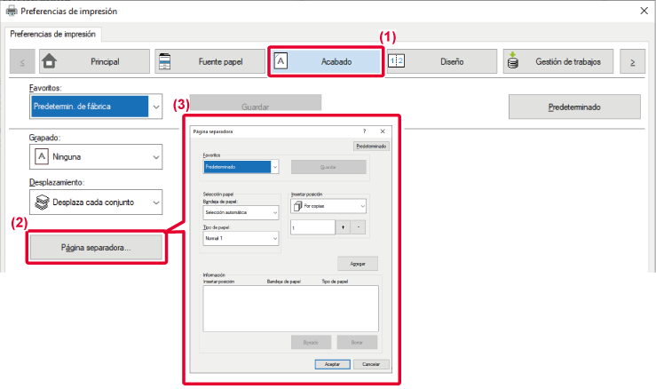 Se pueden insertar páginas separadoras entre trabajos o el número especificado de