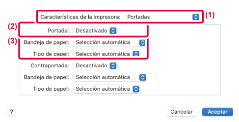 Seleccione la configuración de impresión, la bandeja y el tipo de papel para la portada