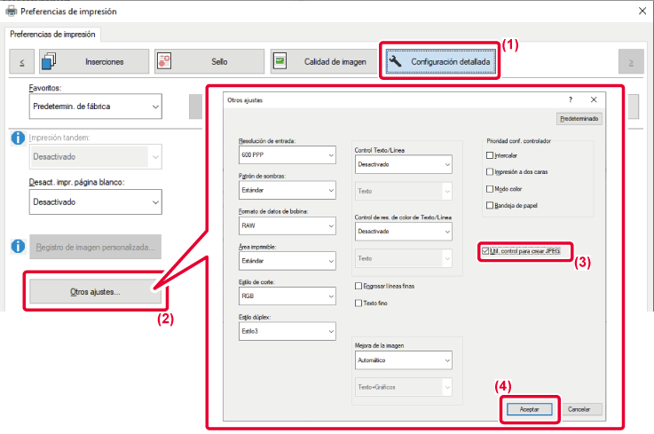 - Haga clic en la casilla de verificación [Util. control para crear JPEG] para que aparezca