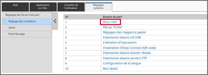 Dans l'état par défaut, vous devez saisir votre mot de passe utilisateur après avoir saisi l'adresse IP.Sur la page Web, cliquez sur l'onglet [Réglages système] → [Réglages de l'écran d'accueil] → [Position du bouton d'accueil].