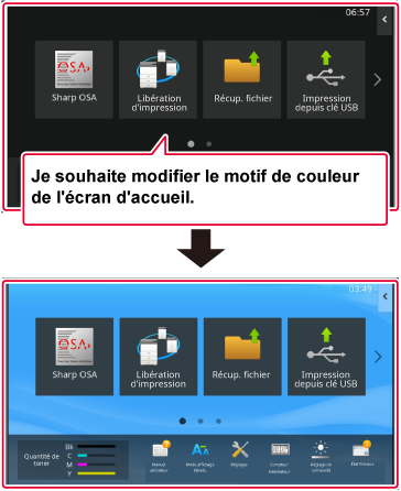 Les réglages sont enregistrés dans la machine et ils sont appliqués.Plusieurs modèles de disposition de l'écran d'accueil sont prédéfinis dans la machine.