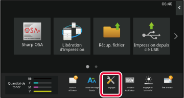 Le "Réglages" permet de gérer différentes fonctions afin de faciliter l'utilisation de la machine, par exemple l'enregistrement par défaut pour chaque fonction, le réglage de la connexion réseau et la vérification du journal de l'état de fonctionnement.