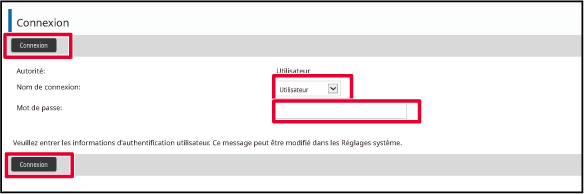 • Pour plus de détails sur les procédures de connexion lorsque l'authentification utilisateur est activée, reportez-vous à la section "AUTHENTIFICATION UTILISATEUR".