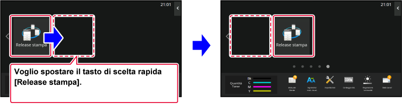 Le impostazioni vengono salvate nella macchina e applicate.Questa sezione spiega come spostare un tasto di scelta rapida nella schermata iniziale.