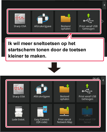 De instellingen worden opgeslagen in het apparaat en worden toegepast.U kunt sneltoetsen toevoegen aan het beginscherm en sneltoetsen die u niet gebruikt