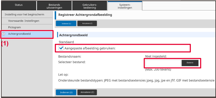 Klik op de knop [Bladeren] en kies de afbeelding die u wilt gebruiken.Wanneer u klaar bent met het aanpassen van instellingen, klikt u op de knop [Indienen].