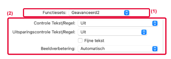 U kunt de randen van tekst en grafische beelden ronder of scherper maken. Auto: Optimale beeldverbetering uitvoeren. Uit: Er is geen beeldverbetering toegepast. Scherp: Beeldverbetering is scherp toegepast. Zacht: Beeldverbetering is zacht toegepast. |