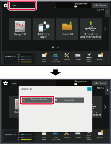 Når du trykker på [Hovedskjerm]-tasten, vises hovedskjermen på berøringspanelet. Hovedskjermen