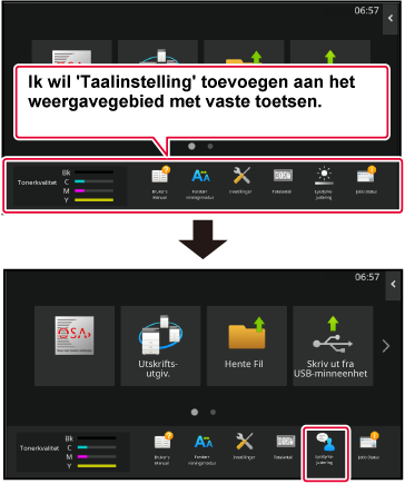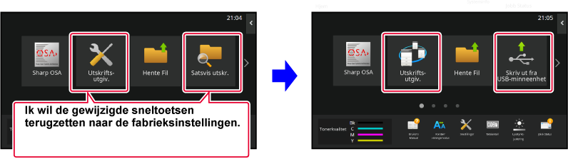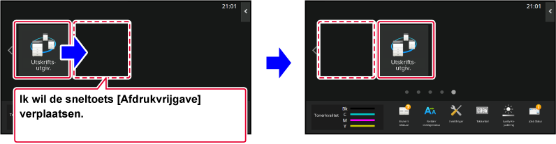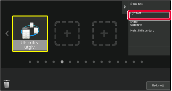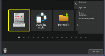 Innstillingene lagres i maskinen og tas i bruk.Dette avsnittet forklarer hvordan du flytter en snarveistast på hovedskjermen.