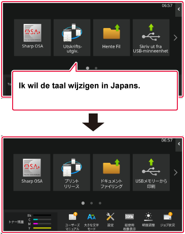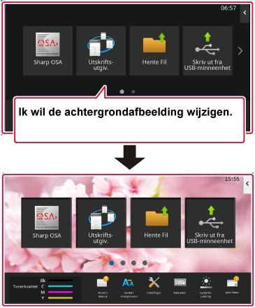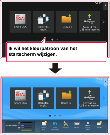 Innstillingene lagres i maskinen og tas i bruk.Maskinen har flere forhåndsinnstilte oppsettsmønstre for hovedskjermen. Disse inkluderer
