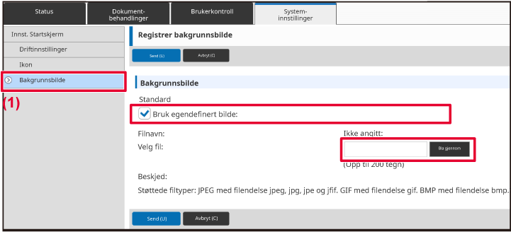 Klikk på [Bla gjennom]-knappen, og velg bildet som skal sendes.Når du er ferdig med å konfigurere innstillingene, klikker du på [Send]-knappen.