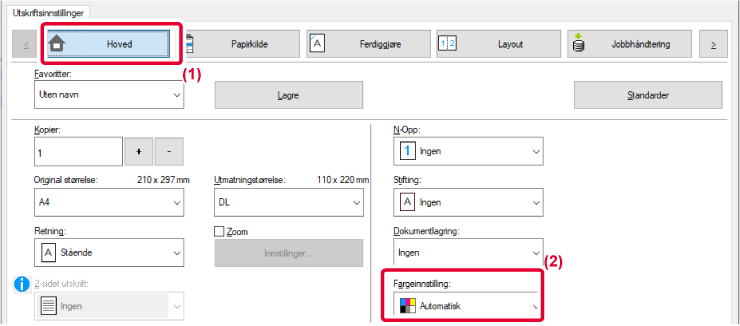 Alle sidene skrives ut i farger. Både fargedata og svart-hvitt-data skrives ut med Y (gul), M (magenta), C (cyan) og Bk (svart) toner. |