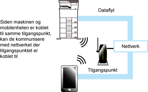 Maskinen og mobilenheten kan kommunisere via nettverk med et tilgangspunkt installert.