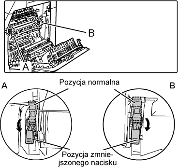 Przesuń (dwie) dźwignie zwalniania nacisku modułu utrwalania do pozycji zmniejszonego nacisku, jak na rysunku.