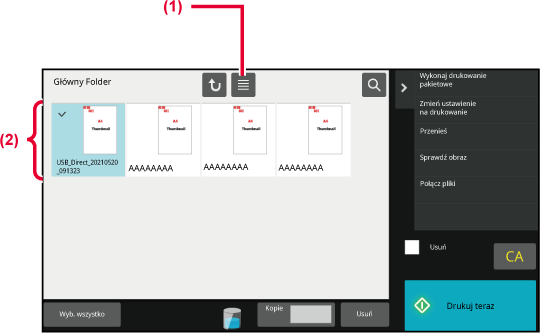 Ekran wyboru pliku można wyświetlić jako "Lista" lub "Miniatura" pokazujący miniatury