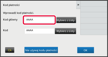 Gdy wyświetlone jest okno wprowadzania kodu płatności, naciśnij przycisk [Wybierz z Listy] obok pola kodu głównego.