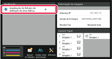 Quando um vírus é detetado em relação aos dados de entrada, o painel tátil irá mostrar que um vírus foi detetado, os dados de entrada ou o trabalho a ser introduzido serão cancelados e os dados de saída ou os dados do trabalho a ser impresso serão descartados. Os dados na fonte de entrada de dados (dispositivo de memória USB, servidor externo, etc.) não serão apagados. Quando um vírus é detetado com os dados de saída, o painel tátil irá mostrar que um vírus foi detetado, os dados de saída ou o trabalho a ser impresso serão cancelados e os dados de saída ou os dados do trabalho serão apagados. A mensagem de deteção de vírus será exibida na "Notificação" do ecrã de Informações do Sistema. |